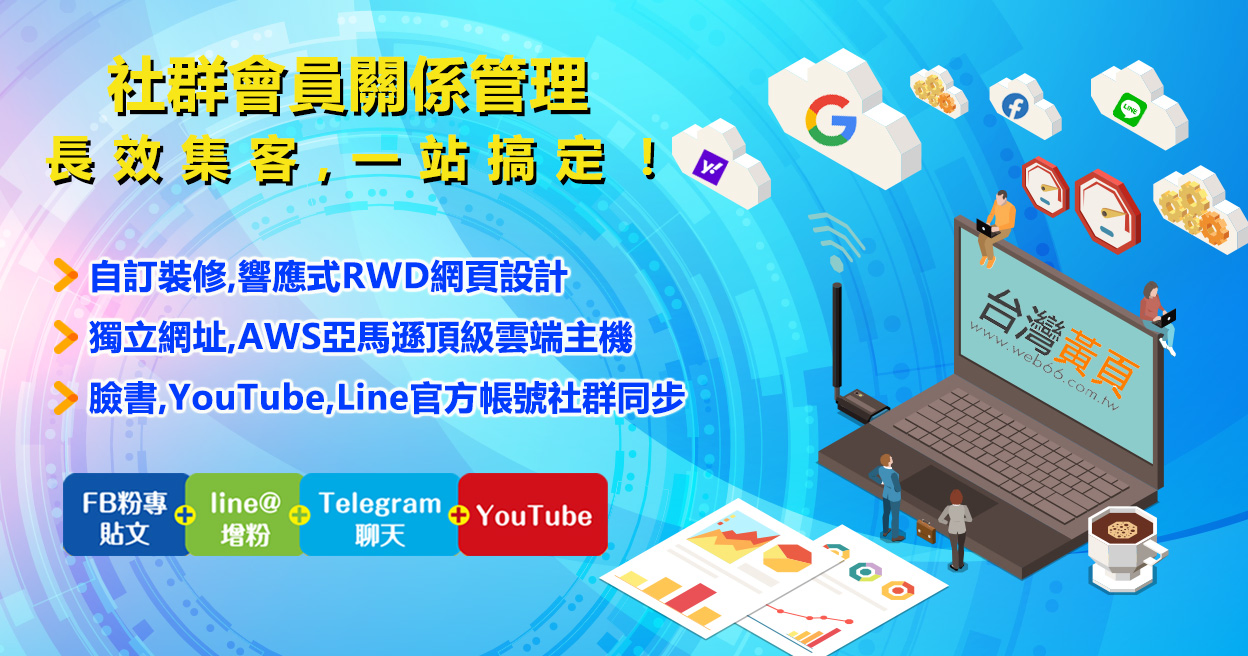 台灣黃頁“長效集客,社群生態” 社群會員關係管理 獨立官網/網店+LOGO+UI簡裝+手機桌機響應式RWD+SEO優化+google Sitemap+獨立網址+AWS亞馬遜頂級雲端主機+GA+GTM設定,再送10組關鍵字SEO外鏈1000頁曝光! 優惠價 18800 年費6000起 社群同步: FB粉專貼文同步及會員管理 ,YouTube頻道視頻上傳同步及會員管理 .LINE官方帳號Login及LIFF串接 .黃頁買家會員管理 .網店會員管理。
